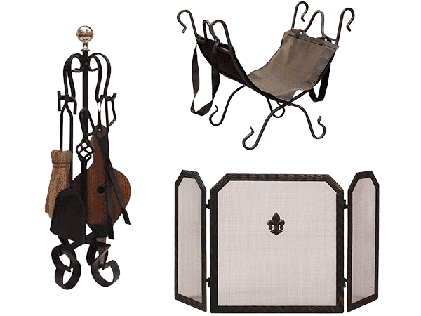 Каминные аксессуары Royal Flame представляют собой: каминные наборы - комплект из кочерги, щипцов для поленьев, совка для сажи и метелки, закрепленных в подставке-держателе; дровницы; экраны. Могут быть стилизованы под классические или современные интерьеры.
